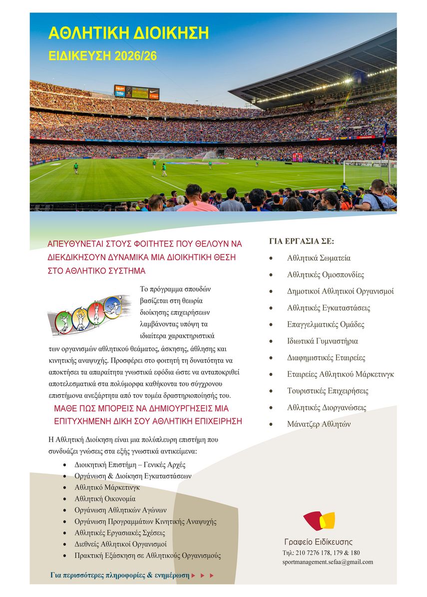 Για περισσότερες διευκρινίσεις, απευθυνθείτε στο e-mail: sportmanagement.sefaa@gmail.com