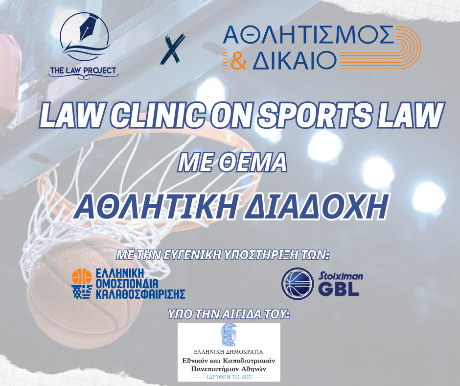 Το The Law Project σε συνεργασία με το περιοδικό Αθλητισμός & Δίκαιο σας παρουσιάζουν το Law Clinic Αθλητικού Δικαίου με θέμα «Αθλητική Διαδοχή» υπό την αιγίδα του Εθνικού και Καποδιστριακού Πανεπιστημίου Αθηνών και με την υποστήριξη της Ελληνικής Ομοσπονδίας Καλαθοσφαίρισης και της Stoiximan Greek Basketball League.